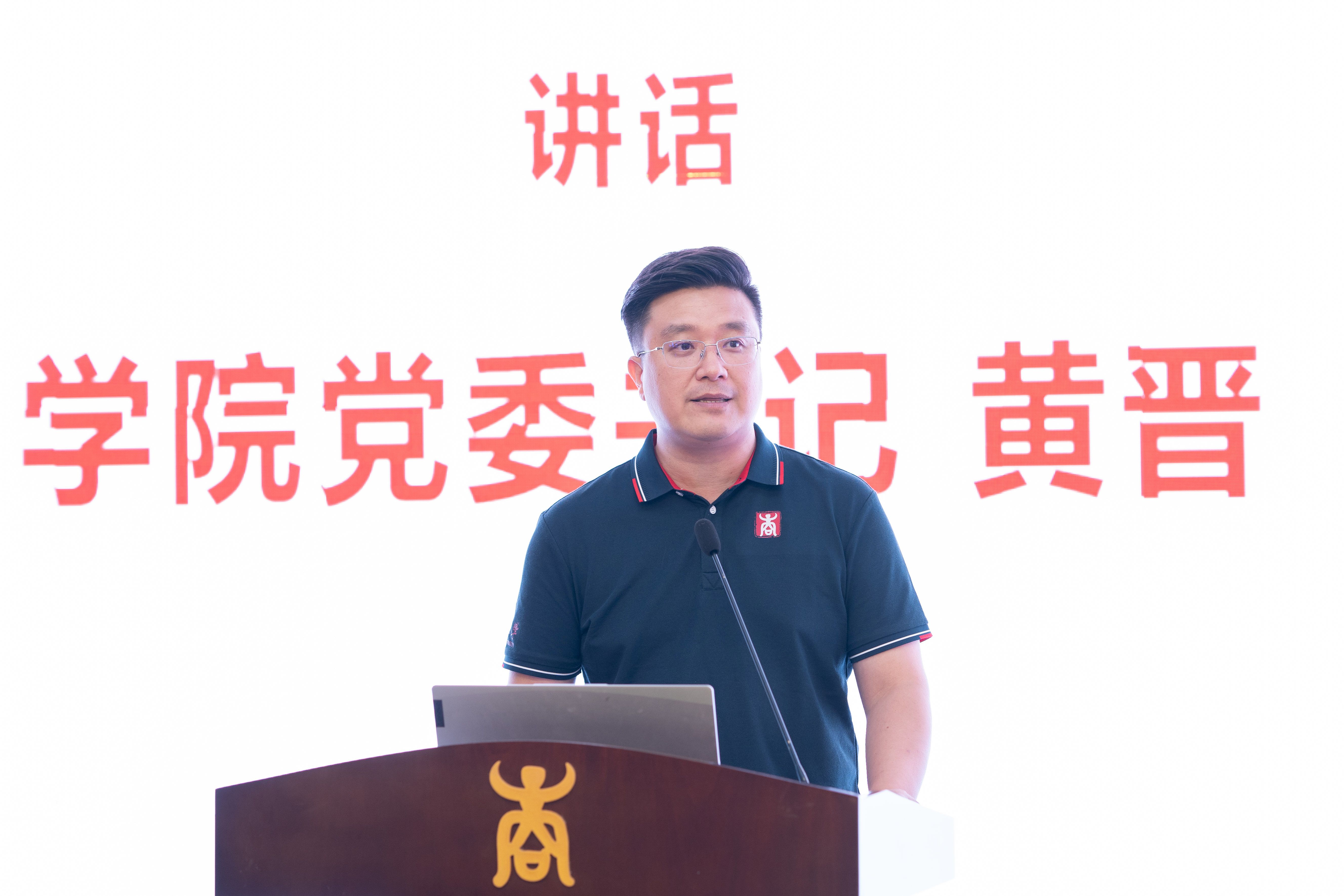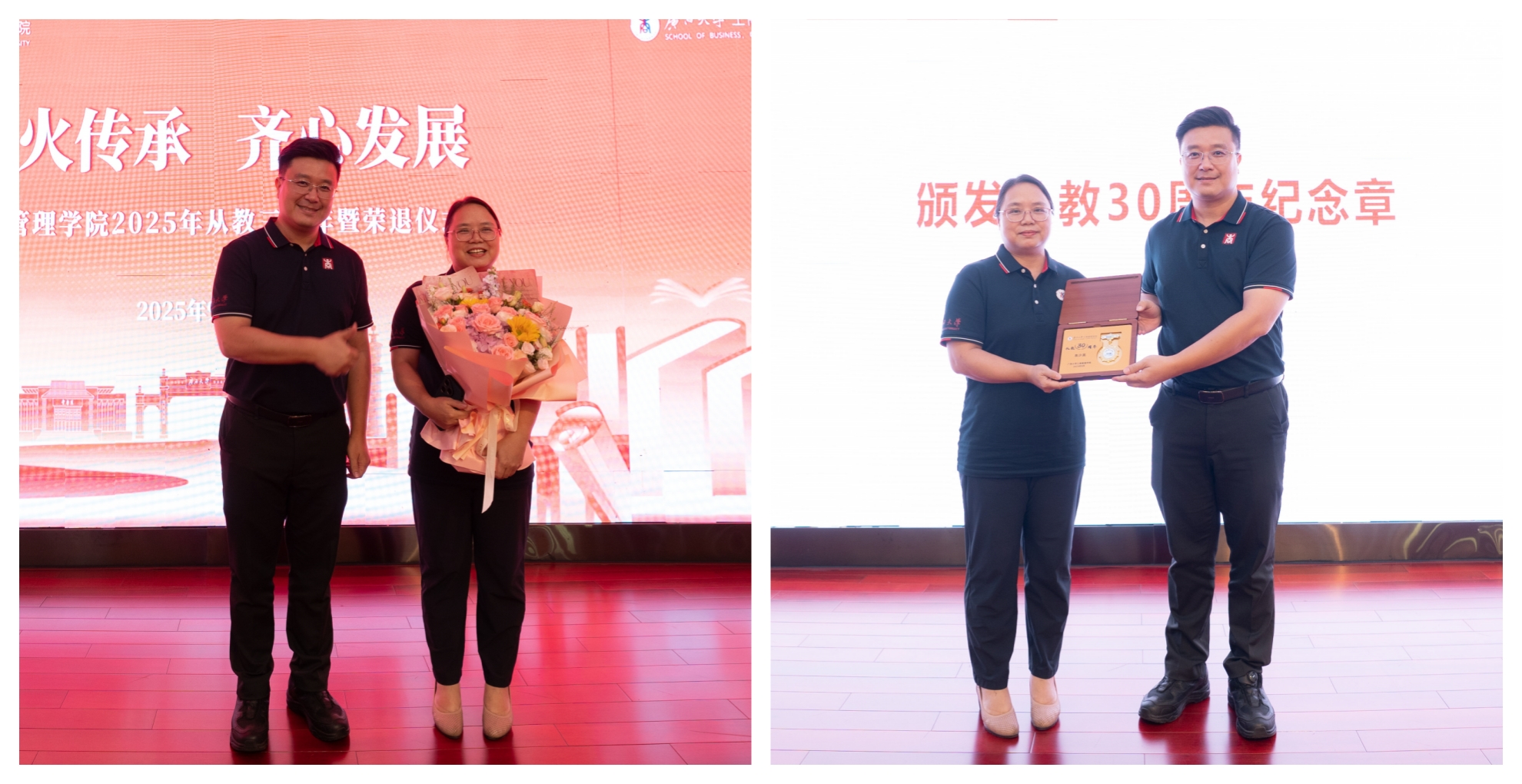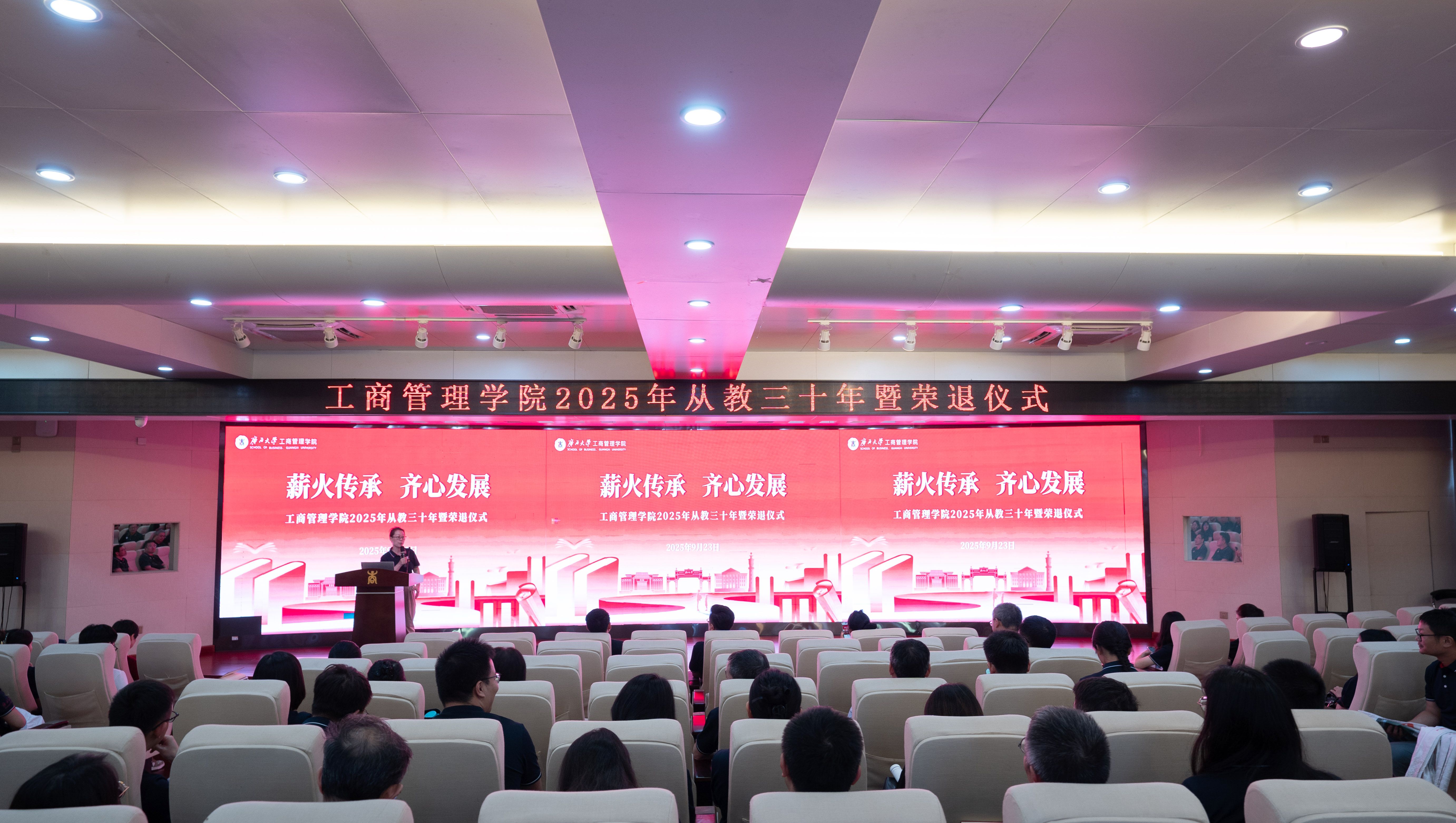 黄晋代表学院向五位老师表达最诚挚的敬意。他指出,学院每一份成就,都不是凭空而来的奇迹,而是像五位老师这样,一代又一代工商人“接力奋斗、无私奉献”的结果。感谢老师们以半生奉献托举学院的发展,让学院的每一步前行都有坚实的支撑,希望年轻老师们,接过前辈手中的“精神火炬”,从三十年执教的坚守里汲取定力,从半生耕耘的热忱中汲取力量,在教书育人的岗位上勇担使命、再建新功。