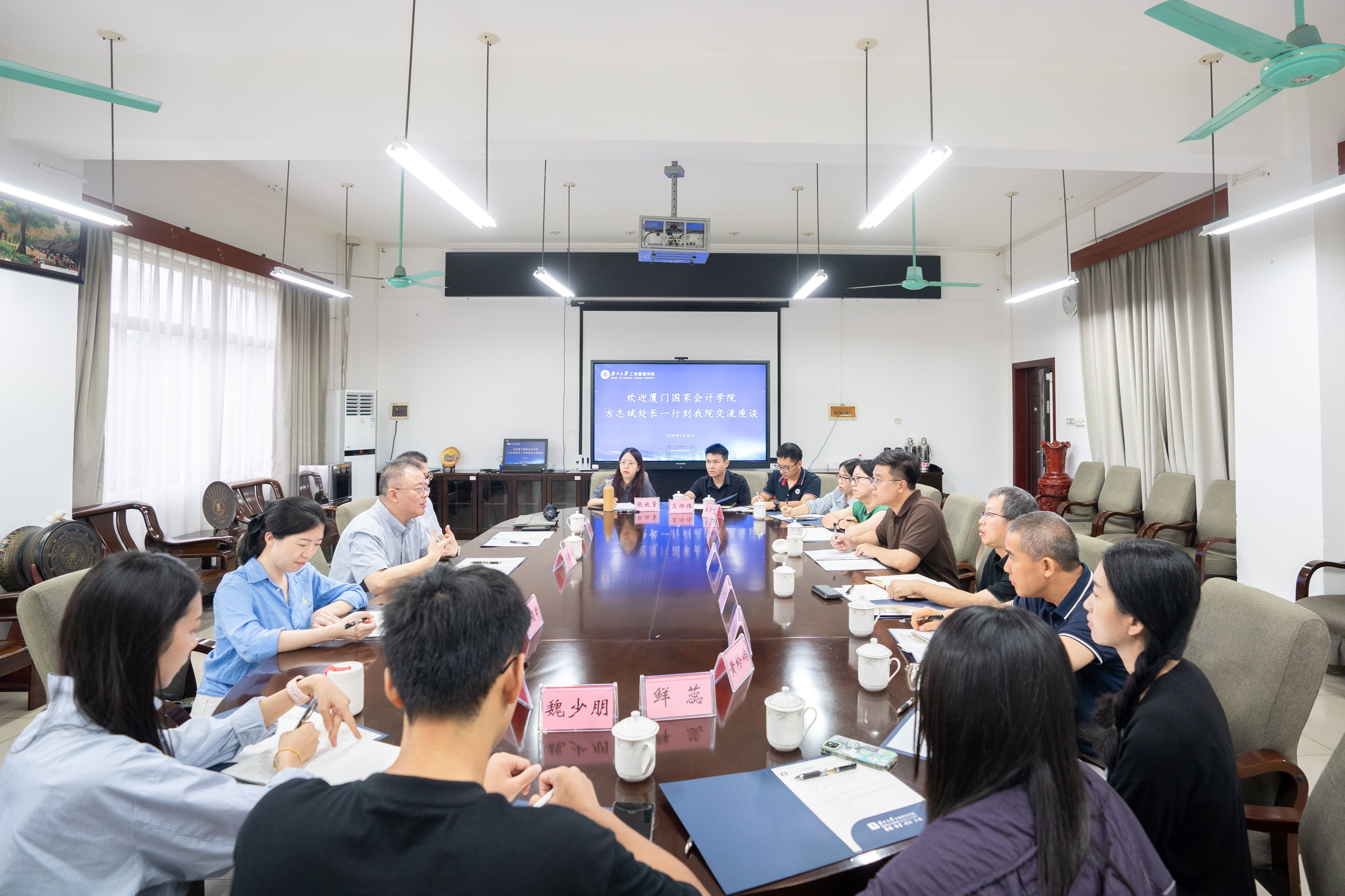 9月25日,厦门国家会计学院教研中心主任蔡剑辉、研究生处处长方志斌一行到我院调研交流。学院党委书记黄晋出席座谈会,院长朱帮助会见了厦门国家会计学院一行,会计与财务金融系教师代表参加座谈会。