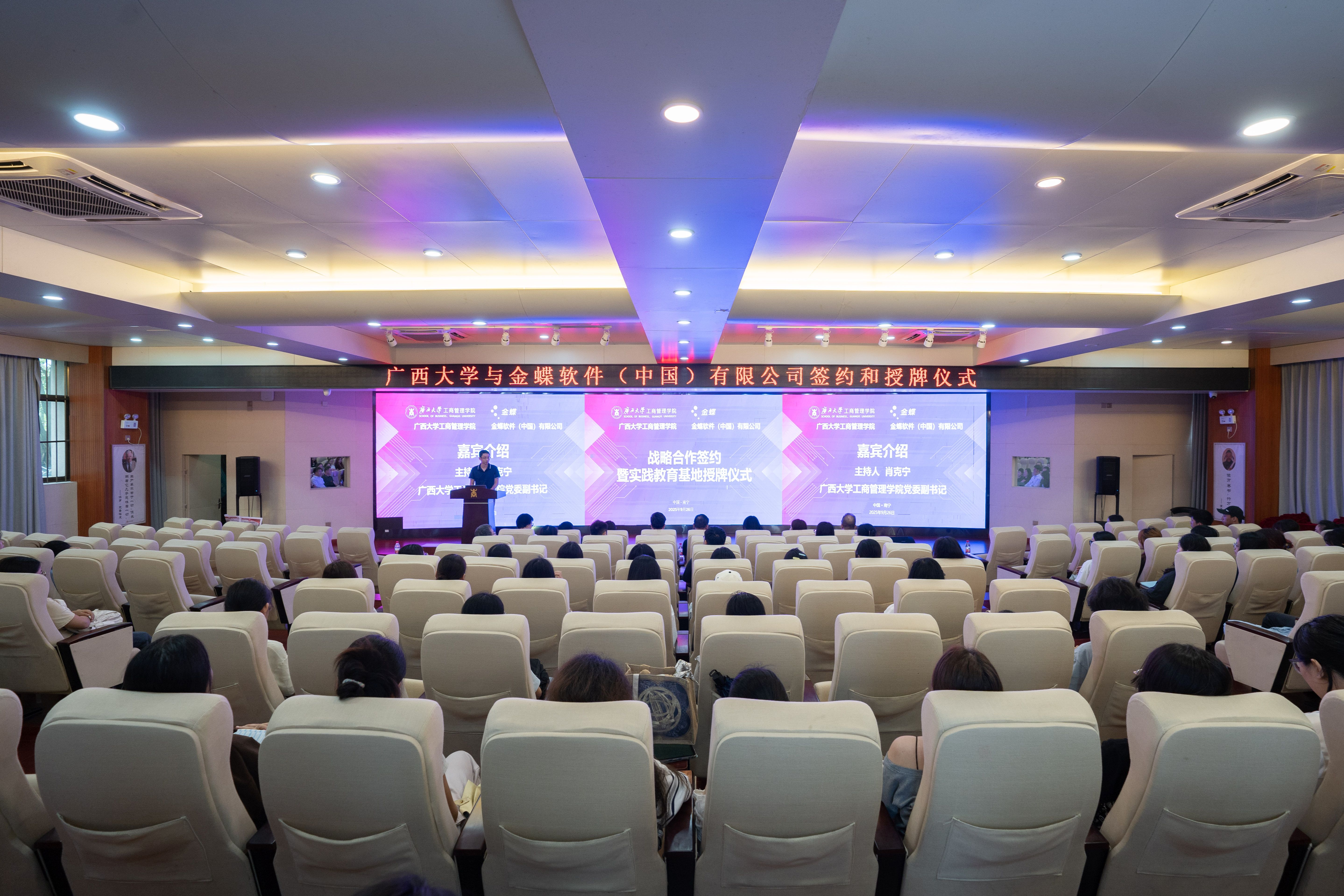 金蝶广西分公司市场部总监游阳、解决方案部高级顾问邓旭、院校业务经理韦晓春,威尼斯886699党委办主任、团委书记马丽娟,会计与财务金融系师生代表80余人参加了仪式。