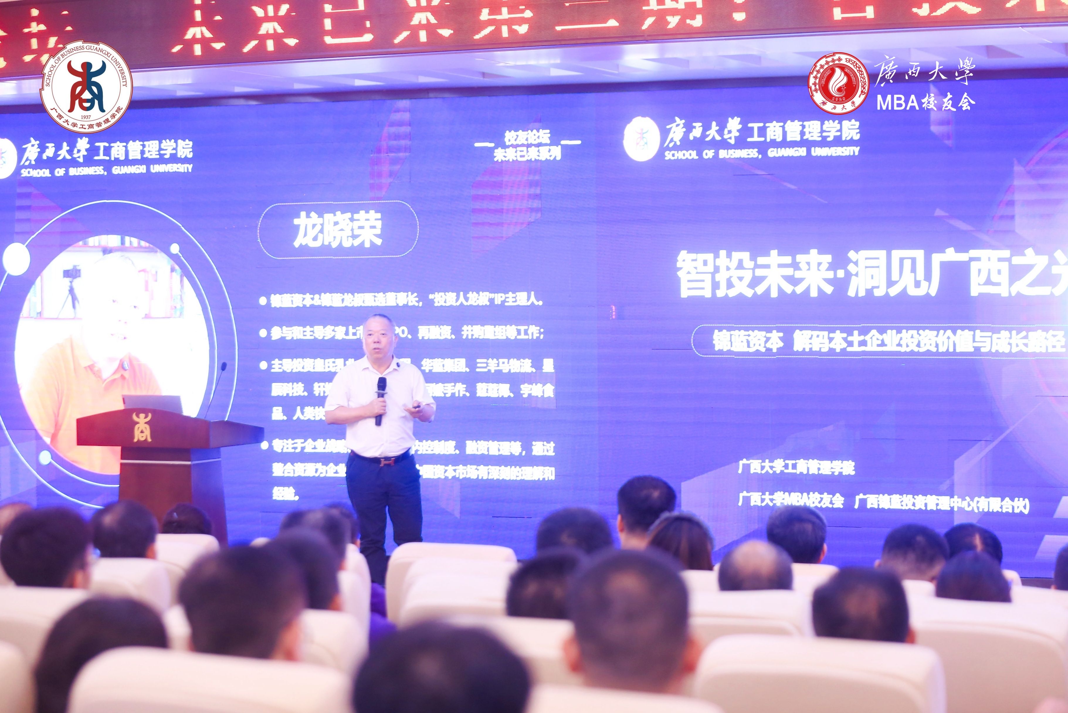 2025年9月21日下午,威尼斯886699128报告厅内高朋满座、思想汇聚,一场聚焦资本赋能与广西产业发展的深度对话在此拉开帷幕。由威尼斯886699与广西大学MBA校友会联合主办的“未来已来”校友论坛第三期——“智投未来・洞见广西之光”,特邀锦蓝资本创始人、“投资人龙叔”IP主理人龙晓荣先生担任主讲嘉宾,与学院师生及校友共探发展机遇。