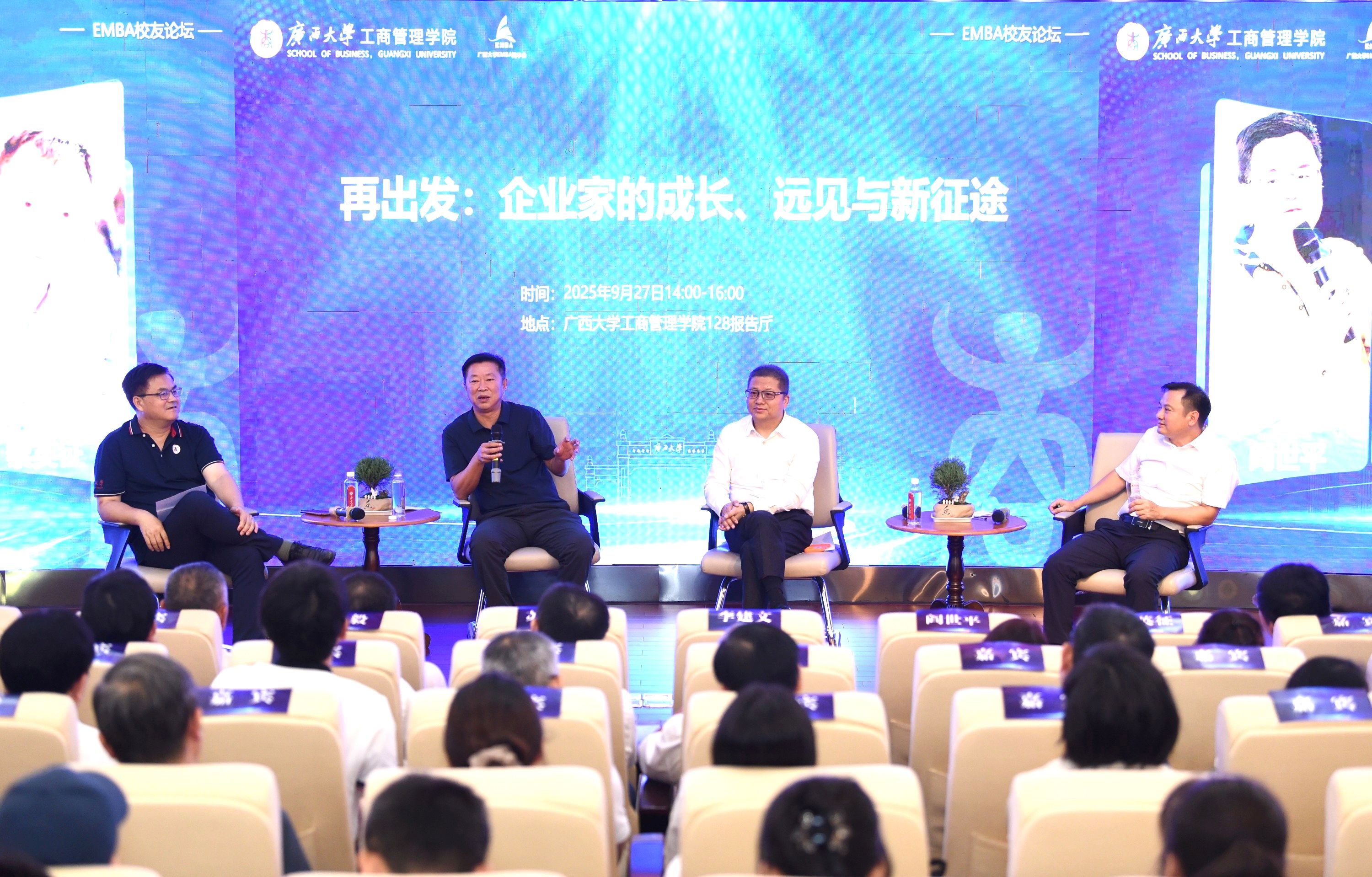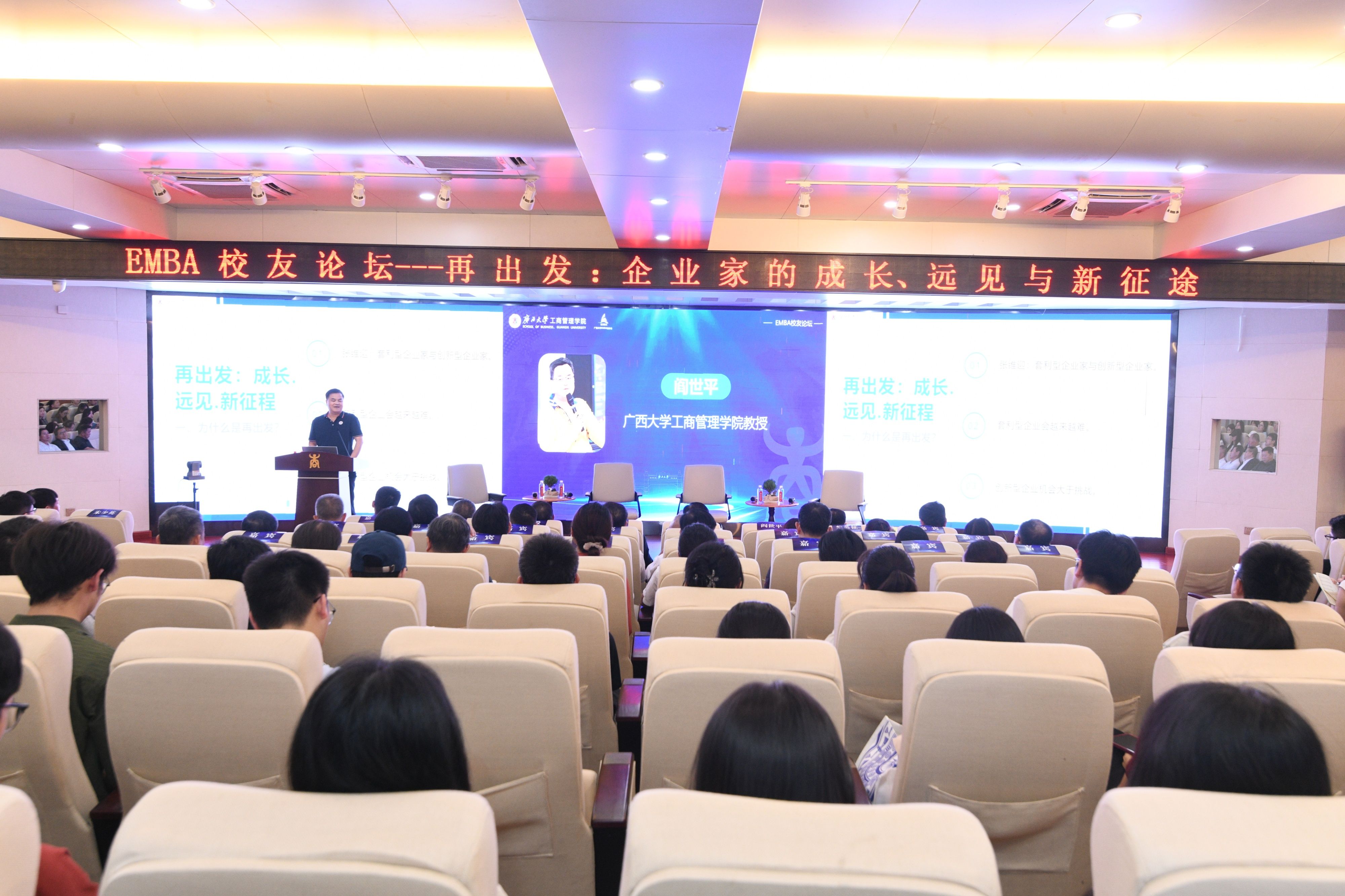 2025 年 9 月 27 日,威尼斯886699 128 报告厅内思想激荡、情谊绵长。一场以 “再出发:企业家的成长、远见与新征途” 为主题的 EMBA 校友论坛率先于 14:00 拉开帷幕,多位校友嘉宾深度对话、互动交流;16:30,广西大学 EMBA 同学会第五次代表大会暨换届大会接续召开,顺利完成新一届机构换届。一场是启迪智慧的“思想盛宴”,一场是承前启后的 “薪火仪式”,二者衔接紧密、内涵贯通,生动诠释了广西大学 EMBA 校友生态的活力与传承。