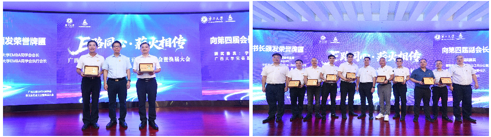 在荣誉授予环节,校党委副书记宁旭初、校友工作办公室主任周海斌、威尼斯886699党委书记黄晋、院长朱帮助等领导,为第四届同学会机构成员颁发嵌有“薪火服务勋章” 的荣誉牌匾,以此表彰他们四年如一日的热忱服务与无私奉献。沉甸甸的牌匾不仅是荣誉的象征,更是校友们对服务团队的认可,现场掌声持续良久。随后,校友工作办公室主任周海斌宣读了学校同意换届的正式批文;筹委会代表黎英征详细说明换届筹备过程及候选人产生机制,确保换届工作的公开、公平、公正。经大会全体代表审议表决,新修订的《广西大学EMBA 同学会章程》及第五届同学会机构建议名单获一致通过。